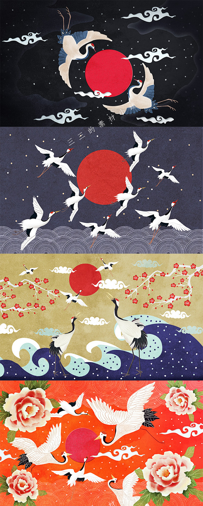 日式和风仙鹤图案中国风psd设计素材古风古典背景壁纸花纹纹样 淘宝网
